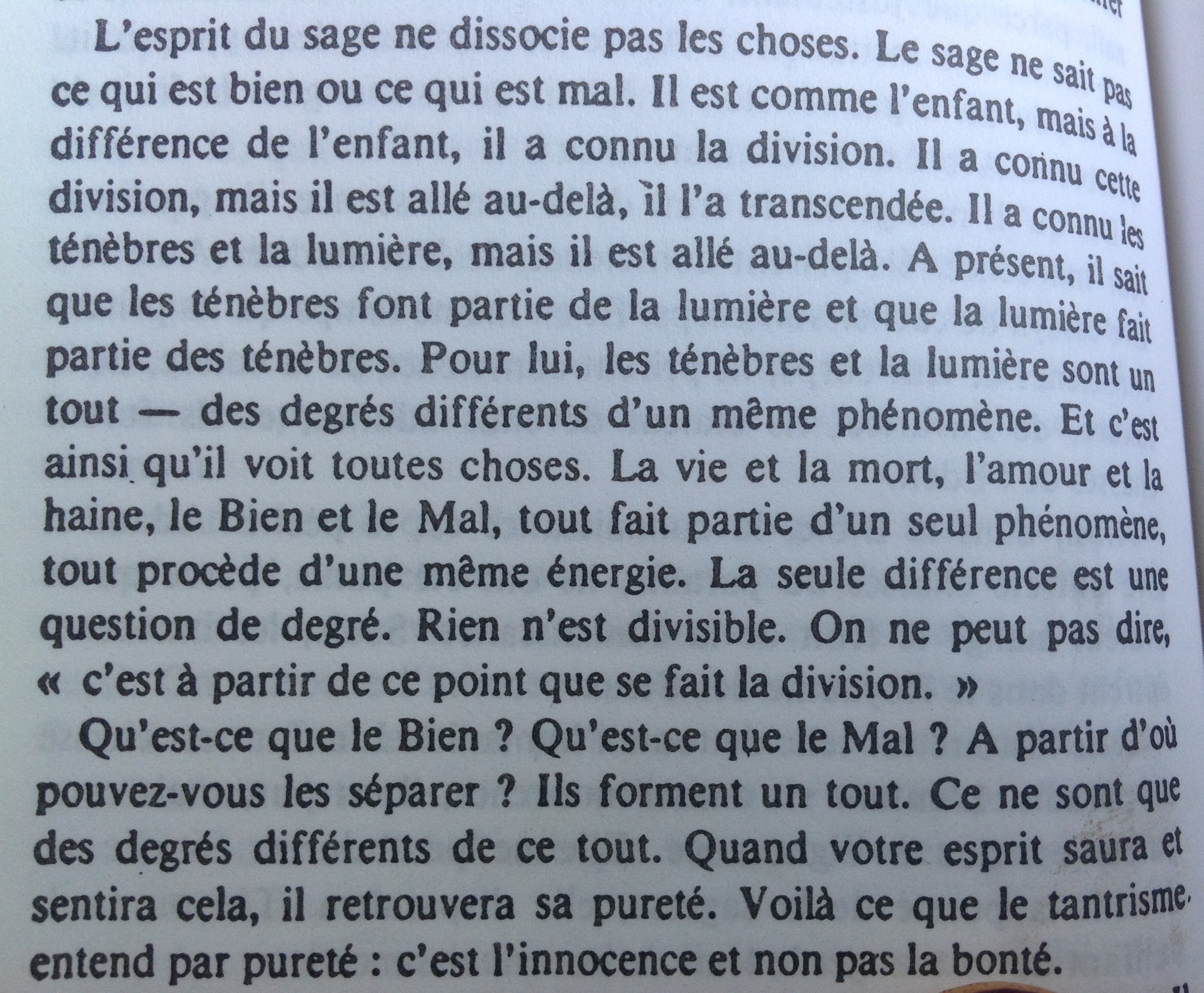 Et cela nous amène au Tantra. Ah, le Tantra !… Puisque je passe (à tort) pour un « spécialiste » de la chose (moi qui exècre toute spécialisation), je vais y aller d’un conseil : si vous rencontrez un monsieur ou une dame qui propose de vous enseigner le Tantra, n’hésitez pas à le ou la pousser dans ses retranchements. Ne vous en laissez pas conter par ses récits fabuleux ni abuser par son coup du regard fixe. Ayez de l’audace (c’est la première qualité tantrique). Interrogez-l’initié de service ou la Shakti des beaux quartiers sur la littérature tantrique : vous vous apercevrez souvent qu’ils n’ont jamais lu un Tantra de leur vie, que leur connaissance du sujet est aussi floue, mais plus arrogante, que la vôtre. Et s’ils feignent de mépriser les textes au nom de la sacro-sainte expérience, alors demandez-leur du concret, percez leur écran de fumée. Si vous leur dites que le sexe ne vous intéresse pas, vous verrez vite qu’ils n’ont pas grand-chose d’autre à vous vendre : des mantras élimés, des rituels de bazar. (…) »